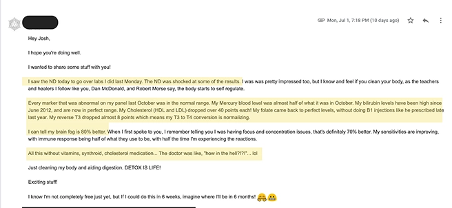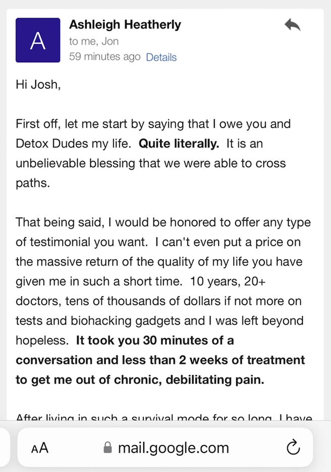 "I feel light and free in the sense that i have no anxiety and not a care int he world [...] western medicine has been taking all of my money and offering me ZERO solutions. THANK YOU DETOXDUDES for saving my life"