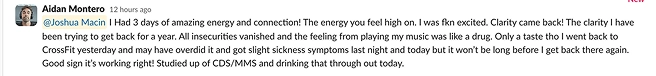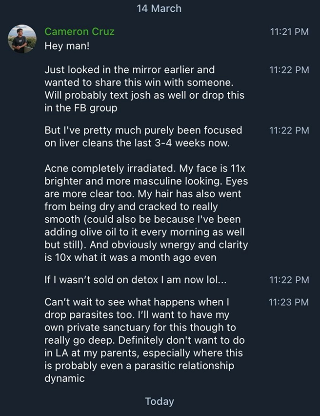 "Acne completely irradiated, my face is 11x brighter and more masculine looking. [...] Energy and clarity is 10x what it was a month ago."